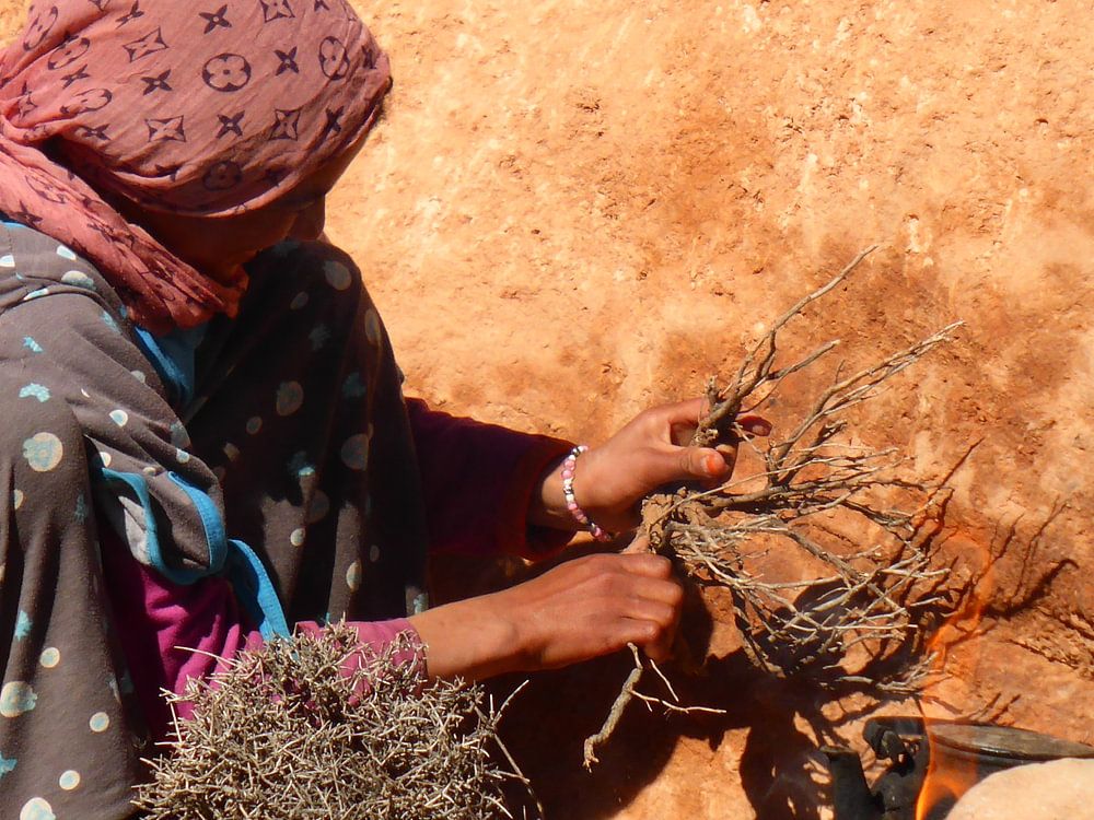 Een Marokkaans meisje in de woestijn maakt vuur om thee water te koken.