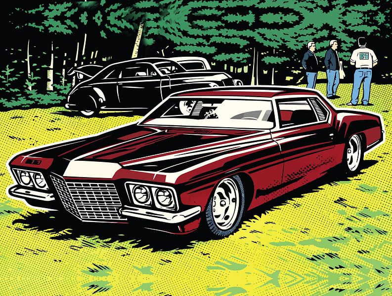 pop art assembly, maroon muscle car, dual…