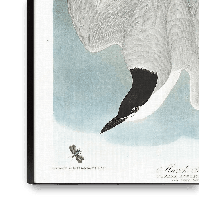 John James Audubon was born on April 26, 1785, in Les Cayes, Santo Domingo, France (now Haiti). From his father´s Pennsylvania estate, Audubon made the first American bird-banding experiments. He began collecting all things ornithological and making pencil and pastel sketches of birds. As his confidence as an artist grew, he ventured into watercolors, the medium he would most often employ. Audubon became a traveling artist, teaching occasional pupils, but always painting local birds and their natural habitats. His major work, a color-plate book entitled The Birds of America (1827–1839), is considered one of the finest ornithological works ever completed. Audubon died on January 27, 1851 in New York City. Note: This artwork can also be obtained without accompanying text in the illustration. Please contact us.