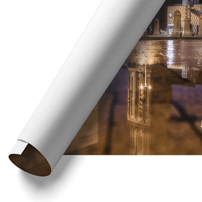 The Martini Tower from the Grote Markt in the city centre of Groningen with the City Hall of Groningen at dusk. The city lights, the reflections and the city bikes give this photo its unique and beautiful appearance.