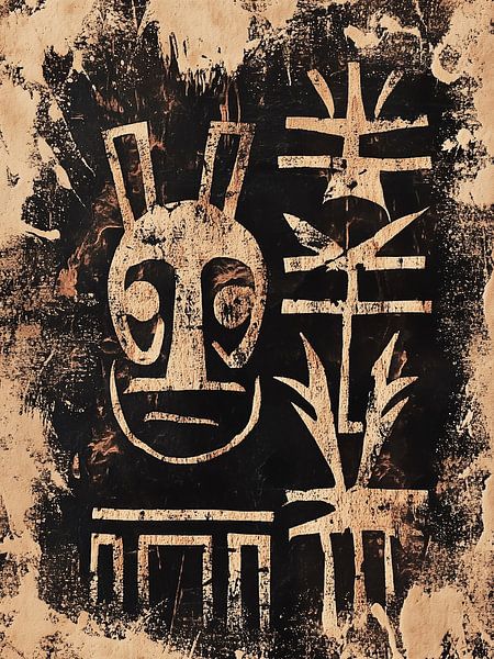Masker van de Oergrond is een krachtig, archaïsch beeld dat lijkt te zijn opgetrokken uit de diepste lagen van het collectieve geheugen. Het masker verschijnt niet als een portret van een individu, maar als een symbool van iets tijdloos: een oervorm waarin mens, natuur en teken samenvallen.