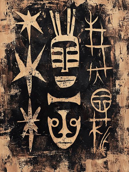 Masker van de Oergrond is een krachtig, archaïsch beeld dat lijkt te zijn opgetrokken uit de diepste lagen van het collectieve geheugen. Het masker verschijnt niet als een portret van een individu, maar als een symbool van iets tijdloos: een oervorm waarin mens, natuur en teken samenvallen.