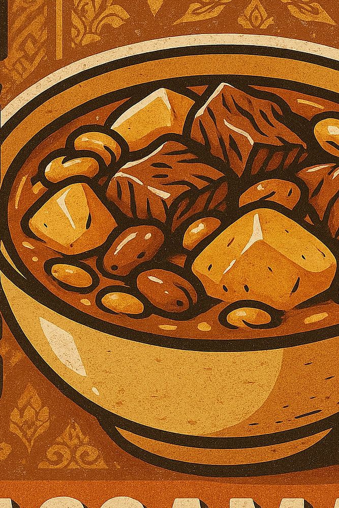 Bring the richness of Thailand’s most aromatic curry into your home with this retro Massaman Curry poster. The artwork features a steaming bowl of curry filled with tender meat, potatoes, and peanuts, framed by golden Thai-inspired patterns and traditional script. With earthy brown and gold tones, distressed textures, and vintage typography, the design perfectly captures the cultural depth of Thai cuisine. Massaman Curry is known for its unique fusion of Thai and Persian influences, combining coconut milk, cinnamon, star anise, and roasted peanuts into a deeply flavorful dish. This Thai curry wall art is a beautiful tribute to the cultural and culinary heritage of Thailand, making it perfect for kitchens, restaurants, or collectors of vintage-style posters. Whether you’re passionate about Thai food, a frequent traveler, or simply someone who loves bold and authentic artwork, this Massaman Curry poster will bring warmth and cultural richness to your décor.