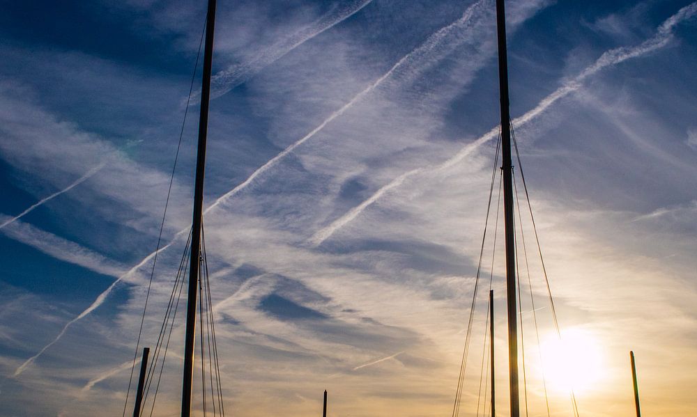 De masten van de catamarans steken mooi af tegen de lucht. zonsondergang in zandvoort.