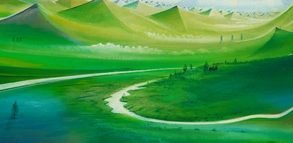 This oil painting, with its two curved rivers, of which the left one even detaches itself and seems to transform into a curve similar to sine and cosine, opens up a fascinating contemplation of the connection between art and mathematics. At first glance, it may appear to be a picturesque landscape, but a closer look reveals that the principles of mathematics have been artistically woven into the creation here.