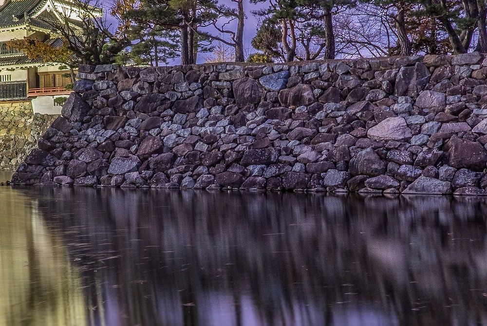 Matsumoto castle photographed during blue hour. Reflections in the water in the foreground.