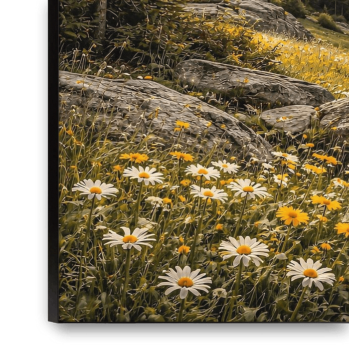 Artistically, the motif impresses with its precise visual direction. The S-curve of the path combines detail and distance, while the rows of trees act as a natural frame, guiding the eye towards the summit. A harmonious palette of natural green, warm meadow gold and cool sky tones creates balance. The gentle lighting mood and the clear staggering of the levels give the picture calm and depth - an effect that does not dominate rooms, but allows them to breathe a sigh of relief.