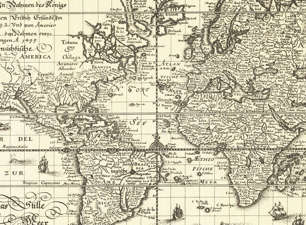 World map from the 17th century, the golden age. continents, cities and oceans are on this map.