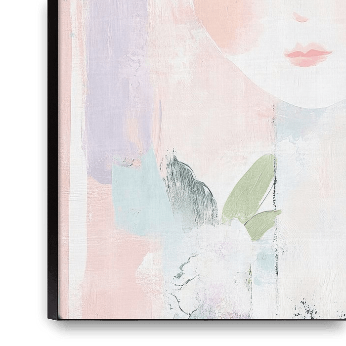 Meditation painting of woman and flowers - This women's painting shows a woman with closed eyes, surrounded by soft, pastel colours and a few flowers, evoking a calm and meditative atmosphere.