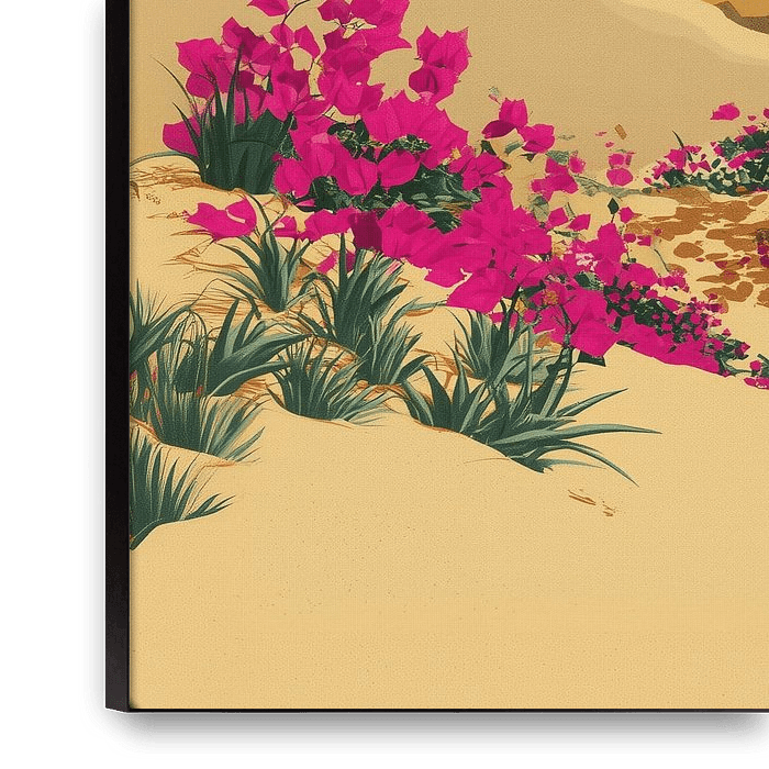 Step into a sun-drenched coastal landscape with ‘ 'Mediterranean Bloom'. Deze strakke, grafische illustratie vangt de essentie van de zomer: een stralende gouden zon boven glooiende duinen en weelderige, felroze bougainvillea. De 'bold simplicity' ’ – the shapes and rich palette of sandy and coral tones create a…