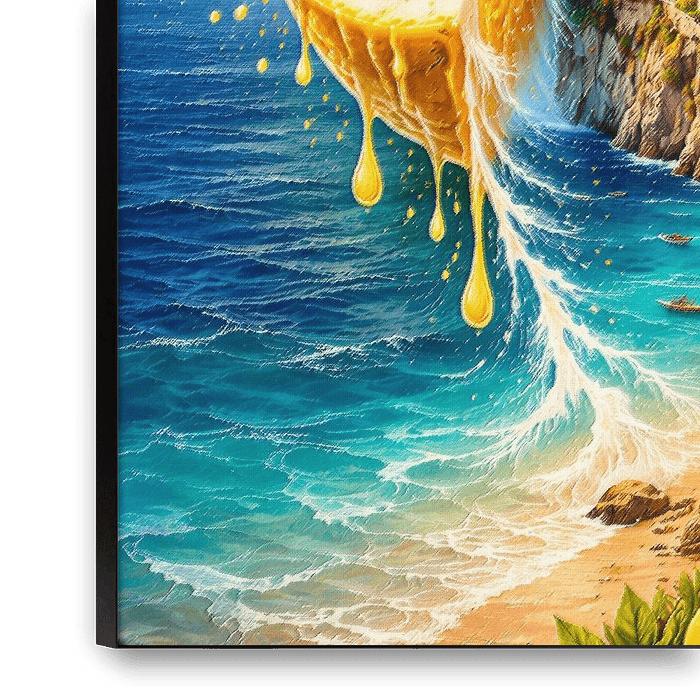 Immerse yourself in a vibrant Mediterranean dreamscape where a giant, succulent lemon slice merges with a sun-drenched coastal cliffside village. This surreal illustration captures the essence of an Italian summer, featuring cascading citrus juice that blends into the turquoise ocean waves. The intricate details of the pastel-colored…