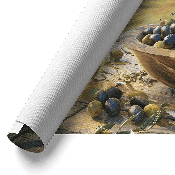 This colourful still life captures the essence of Mediterranean life. Ripe olives and golden olive oil bottles rest on a rustic wooden table, surrounded by lush olive trees under the warm sun. The detailed depiction and vibrant colours transport you straight to a Mediterranean landscape, ideal for kitchen or dining room decor. A perfect…