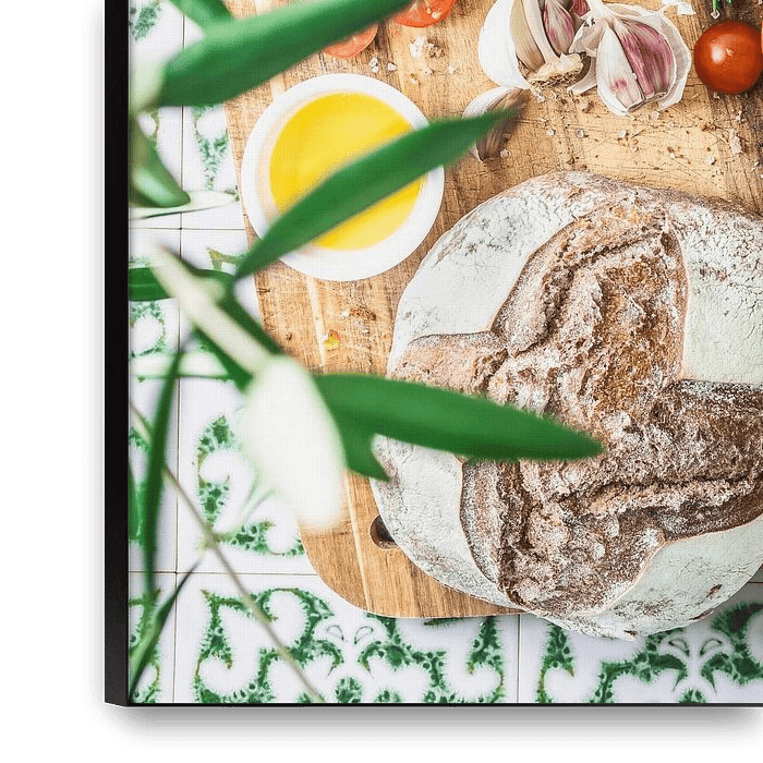 A Mediterranean summer table with olive branches, bread with tomato and sunshine.