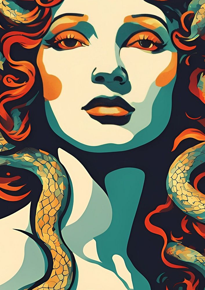 A digital painting depicts Medusa, a mythical Greek figure, with a serene expression. Her head is adorned with a crown of orange roses and white flowers, while her hair is a mass of writhing green snakes. The snakes intertwine around her neck and shoulders, creating a striking contrast against her pale skin.