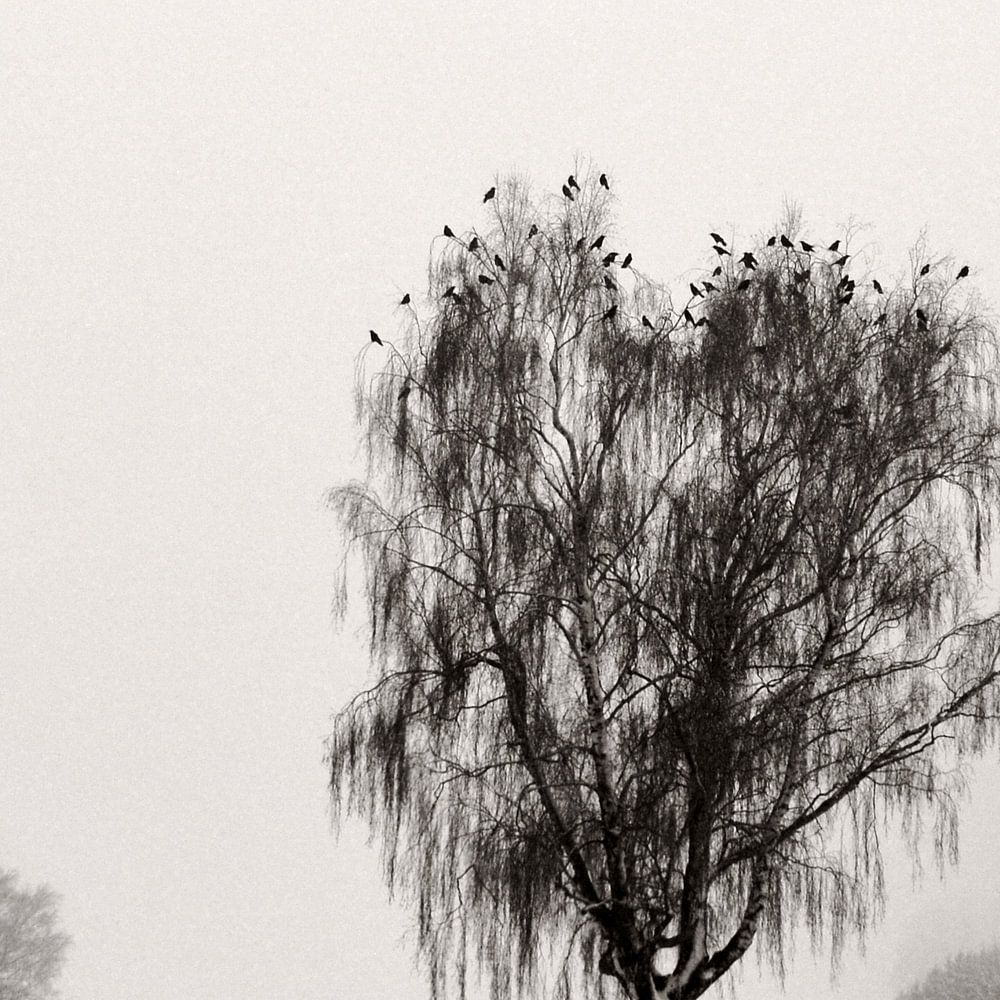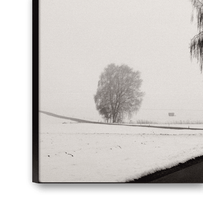 Photograph of a wintry landscape with a road and a tree in minimalist style in black and white.