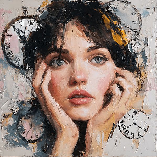 A surreal and emotional artwork depicting a melancholic woman encircled by floating clocks, symbolizing the weight of time and inner reflection. This expressive abstract portrait blends dreamlike storytelling with textured acrylic painting techniques, featuring rich brush strokes and soft pastel tones. Perfect as a statement wall art…
