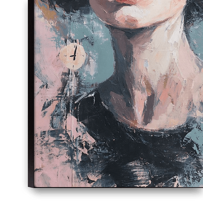 This expressive abstract portrait captures a melancholic woman lost in the passage of time, surrounded by surreal floating clocks that symbolize memory, loss, and emotional weight. Created in a textured acrylic painting style with thick palette knife strokes and soft pastel tones, this artwork blends surrealism and emotional…