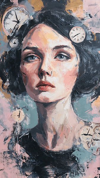 Buy this portrait Melancholic Woman Surrounded by Floating Clocks by Aden Pink Studio on canvas, ArtFrame, poster and wallpaper, printed on demand in high quality.