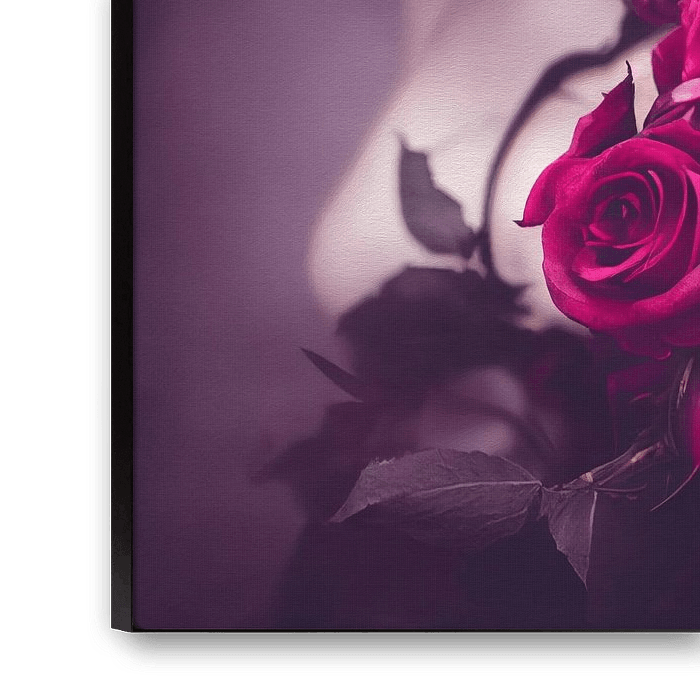 This portrait of a young woman with Victorian aesthetics shows a young lady with red roses in the foreground and with red roses as ornaments in her hair. Her face is surrounded by a melancholic mood, reminiscent of the nostalgia of a bygone era.