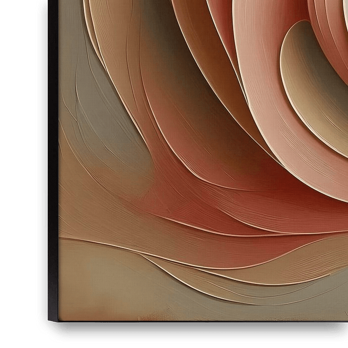 Two abstract figures merge in an intimate dance of form and feeling. Warm earth tones create a quiet harmony, softly broken by a touch of pink. The oil paint gives depth and movement, as if the forms have just found each other. Lines intertwine and dissolve again, creating space for personal interpretation.