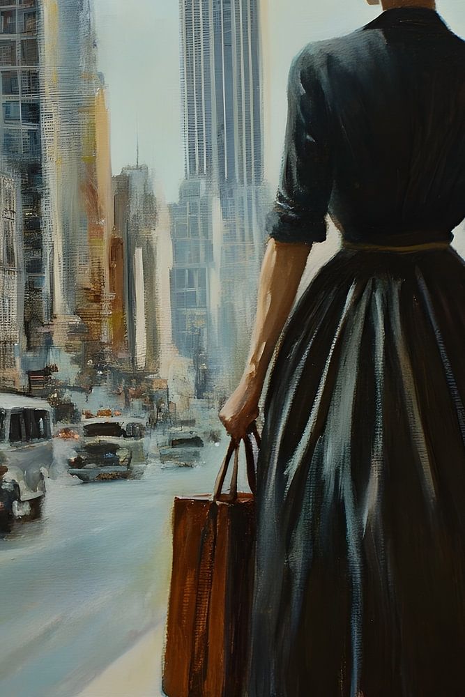 The painting shows a woman in an elegant dress typical of the 1950s, walking along a pavement in Manhattan and gazing thoughtfully into the distance. Her hair is carefully styled and she is carrying a bag that emphasises her stylish appearance. The colours of the dress are dark and harmonious, with a touch of pastel that captures the nostalgic atmosphere of the time.