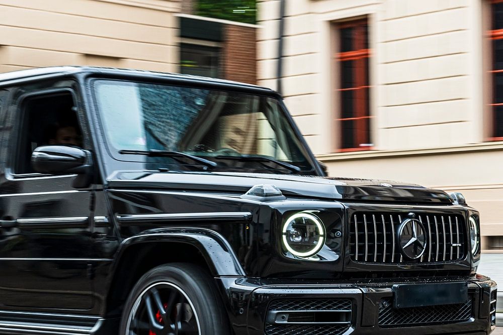 Mercedes-AMG G 63 luxury performance SUV driving on the street in Zwolle. The Mercedes-AMG G 63 is a high-performance luxury SUV that combines the iconic design of the G-Class with the powerful engineering of AMG. Known for its ruggedness and off-road capabilities, the G 63 takes it to the next level with enhanced power, sportier handling, and a more luxurious interior. It maintains the classic boxy shape while integrating modern features and technology.