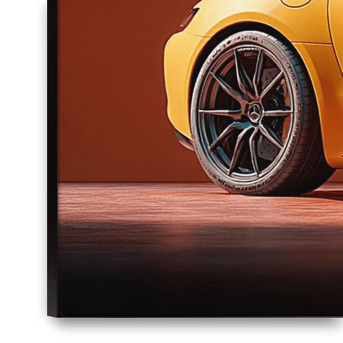 Discover the unrivalled power of the Mercedes-Benz AMG GT: a supercar that embodies speed and style. In this poster, the sleek black bolide jumps bright orange on a dark background, with aggressive lines, shiny rims and menacing headlights. Feel the adrenaline of 585 hp and top speed of 310 km/h. Super cool for car lovers!
