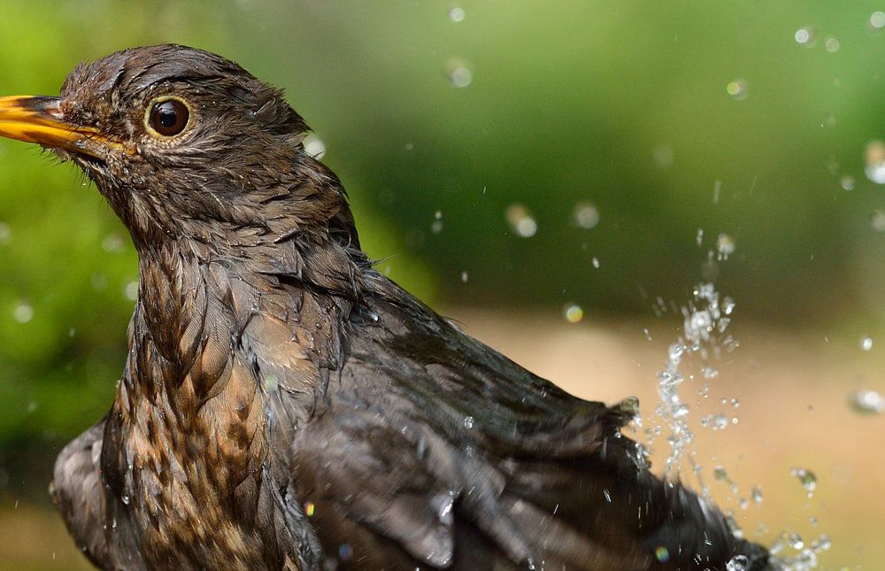Deze merel neemt een verfrissend bad op een warme zomerdag.....