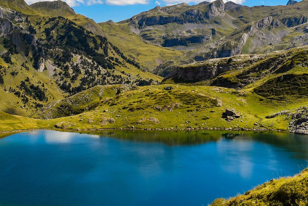 Een landschapsfoto van de meren van Ayous, een gebied in de vallei van Ossau in de Franse Pyreneeën