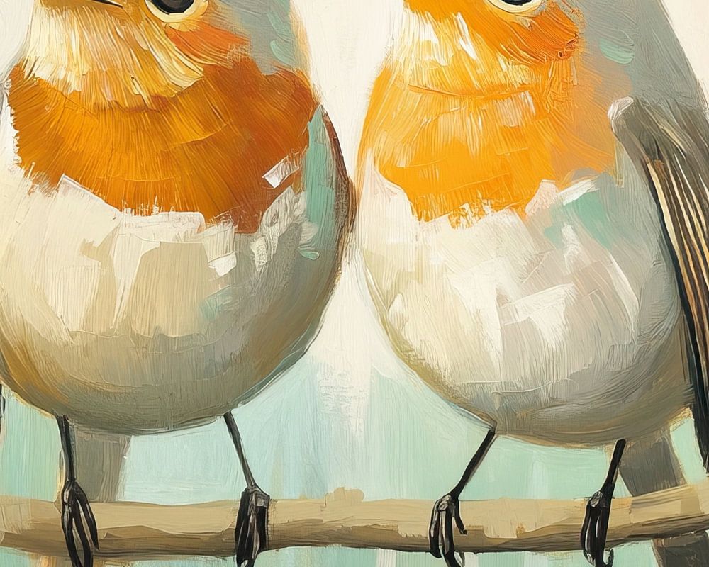 Cheerful Birds - This bird painting shows two cute little birds with orange breasts, sitting together on a branch, in a cheerful and soft background of light green and beige tones.