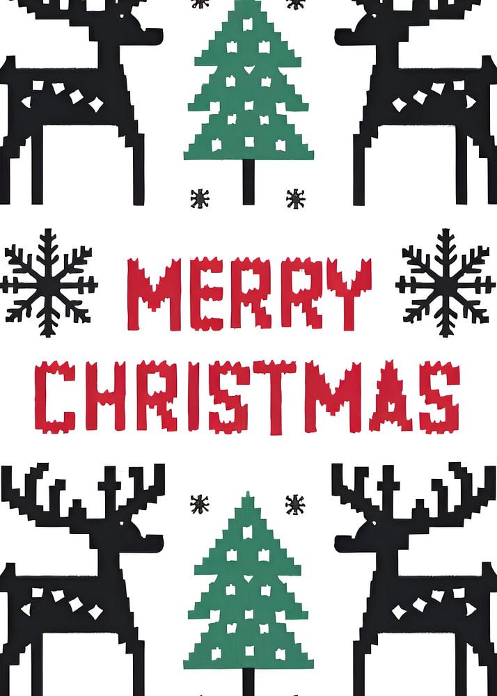 An illustrated Christmas poster with the text “MERRY CHRISTMAS” and patterns of reindeer, snowflakes, Christmas trees in the style of Nordic folk art.