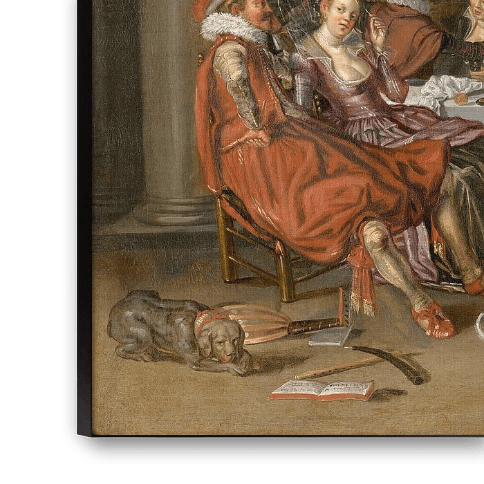 On a garden terrace, young couples are gathered around a long, set table. The elegant young people are depicted with a good dose of irony: dressed in the latest fashions and seemingly rather self-absorbed. The table includes a peacock pie and on the right precious crockery is displayed. On the floor are musical instruments and in the centre is a wine cooler with barrels, on which a little dog is sniffing. Large columns with draperies on the left and right give the setting a palatial feel. In the background, a church can be seen among the trees - given the overgrowth along the tower, the structure is in a dilapidated state. The contrast with the lavish luxury in the foreground is so great that it seems Buytewech is placing a moralising footnote here.