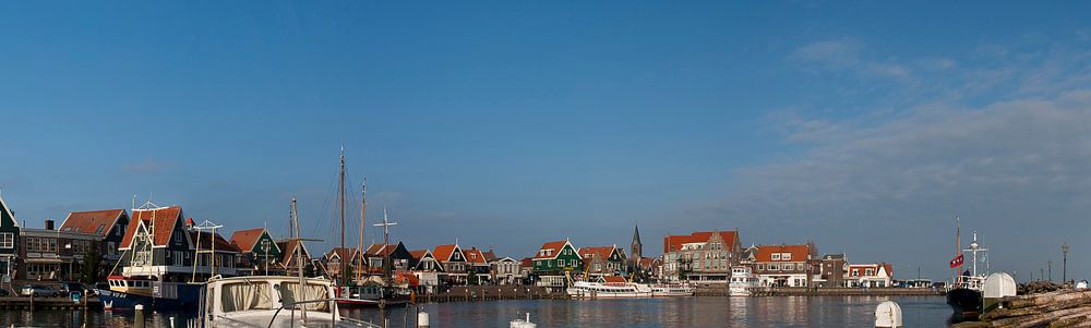 Een uit meerdere foto's opgebouwde panoramafoto van de haven van Volendam