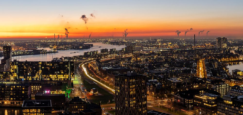Evening photo of Rotterdam from the Euromast. This picture clearly shows the size of the city. In the distance the chimneys of Pernis and even further Europoort.
