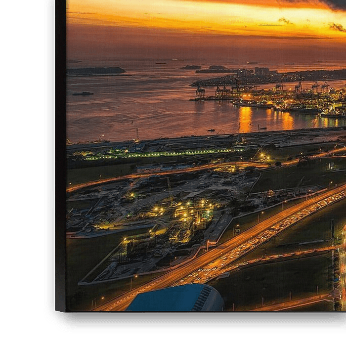 Roads: On the left side of the photo, illuminated roads can be seen leading to the city. The lights of the cars create long, yellow stripes that emphasise the city's movement and activity.