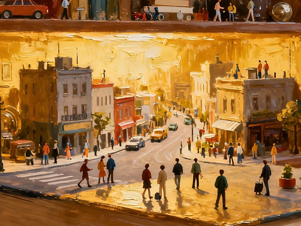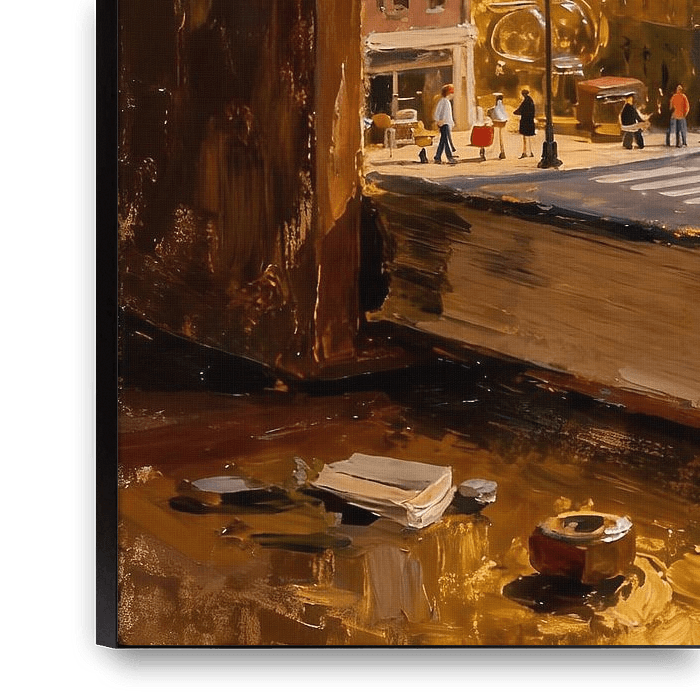 A dreamy city unfolds on a bookshelf. Warm, golden light floods the small street scene as tiny people go about their daily lives. Embedded in a bookshelf, a poetic interplay between literature and urban life emerges. The visible, impasto painting structure lends the motif depth and an almost tangible materiality. This work combines…