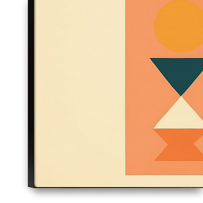 Six sleek panels display a rhythmic grid of circles, triangles, crescents and wavy lines. The palette combines warm coral and ochre with cool turquoise and dark blue, complemented by calm cream areas. The clear edges and division of space create balance, while asymmetrical combinations add excitement. The composition references…