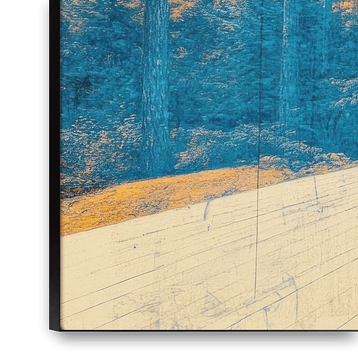 Dit levendige collage kunstwerk presenteert een fascinerende interpretatie van een midcentury moderne villa, ingebed in een bosrijke omgeving. De compositie is een dynamische mix van architectonische precisie en artistieke vrijheid, resulterend in een veelzijdig en intrigerend stuk.