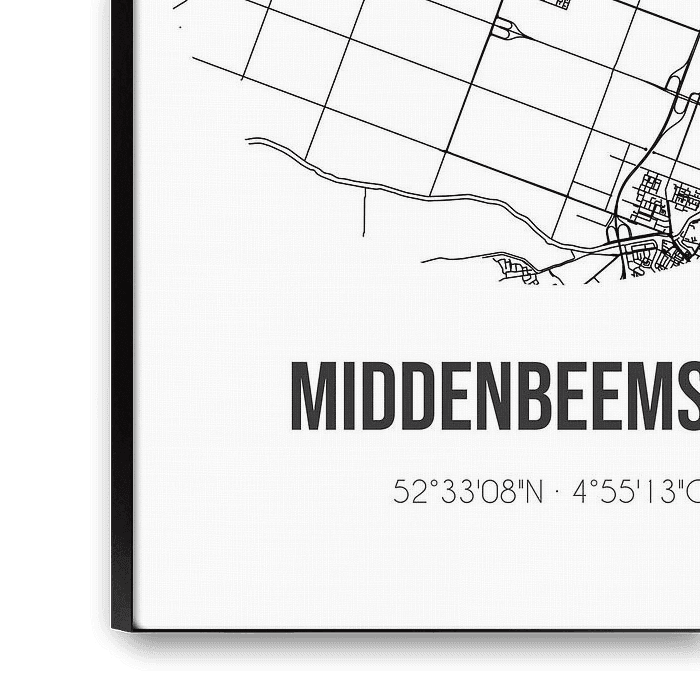 Black and white map, street map or street plan of Middenbeemster. Middenbeemster is located in the municipality of Beemster, province of North Holland. On the city map all public roads in Middenbeemster are included. Furthermore, the map is provided with the coordinates of the center of Middenbeemster.