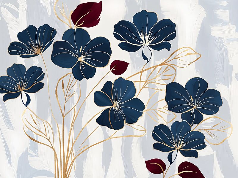 This elegant digital painting features a stylized bouquet of deep blue flowers with delicate gold outlines and accents. The flowers are set against a softly textured background of pale grays and whites, creating a serene and sophisticated aesthetic. A few deep burgundy leaves add a touch of rich contrast to the overall composition. The…