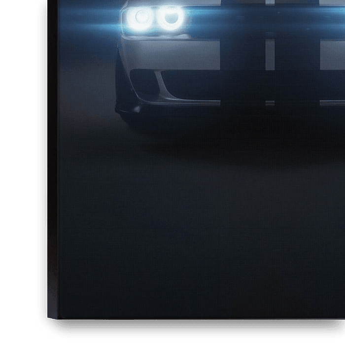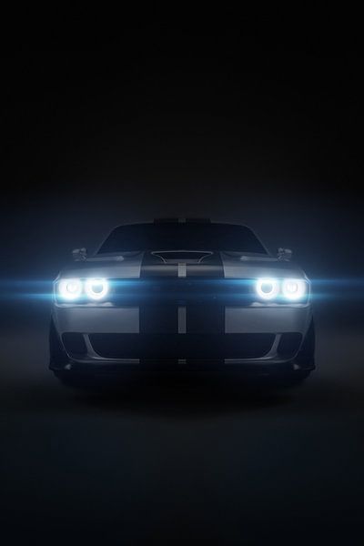 Wrapped in shadows, the Dodge Challenger’s silhouette is defined by its signature quad-halo headlights. The cool blue lens flare adds a futuristic touch to this classic muscle car, creating a mysterious and powerful midnight aesthetic.