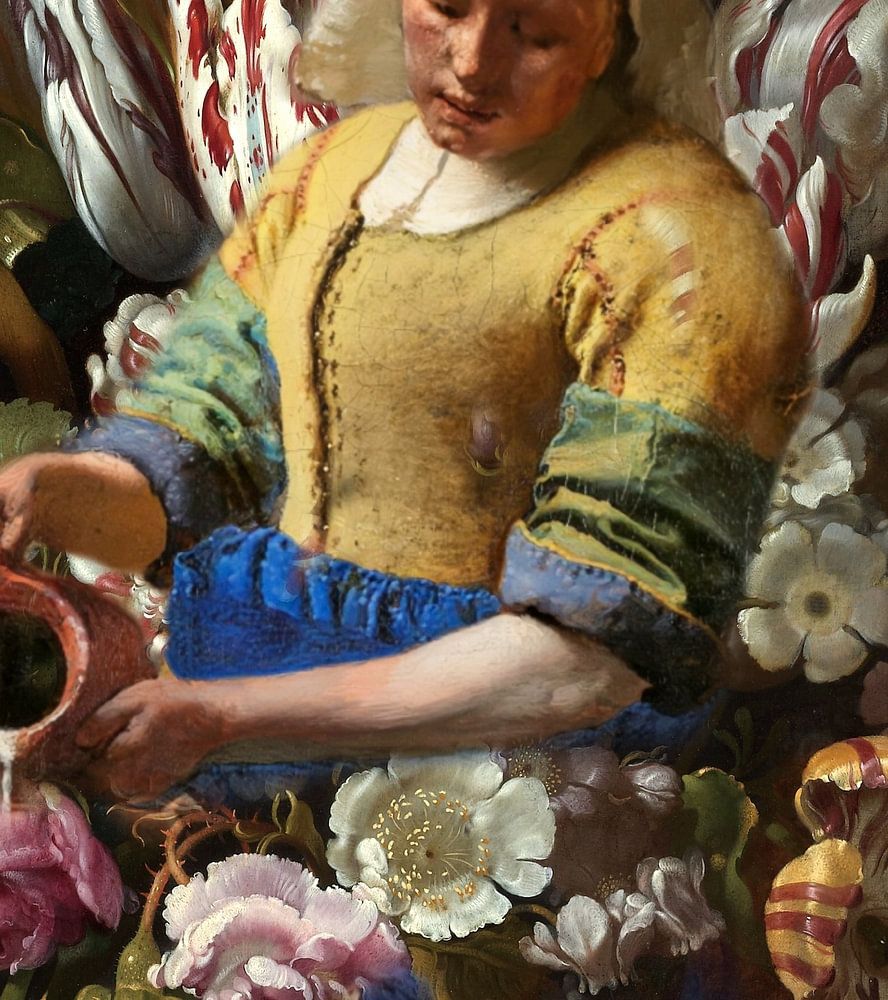 Two old masters united in a collage. Johannes Vermeer's famous milkmaid stands as it were the flower still life of the old master Balthasar van der Ast. The original works hang in the Rijksmuseum in Amsterdam. Art with a twist, from old masters and new masters.
