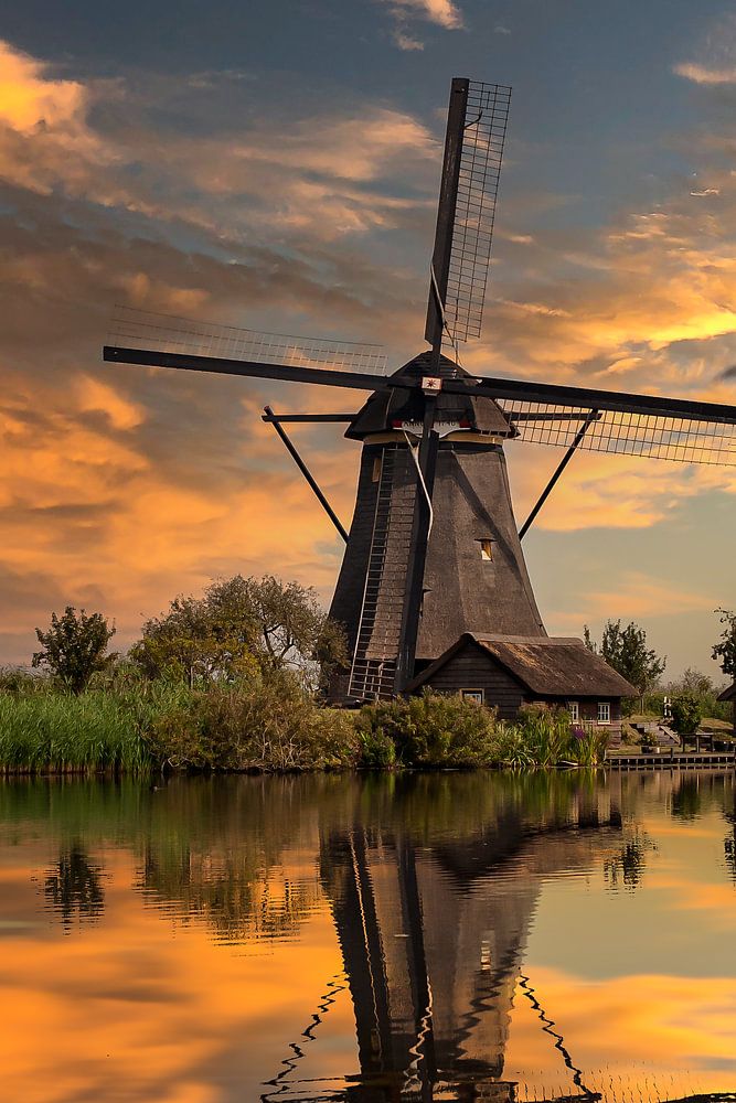 Buy this landscape artwork Mill by water in sunset by René Ouderling on canvas, ArtFrame, poster and wallpaper, printed on demand in high quality.