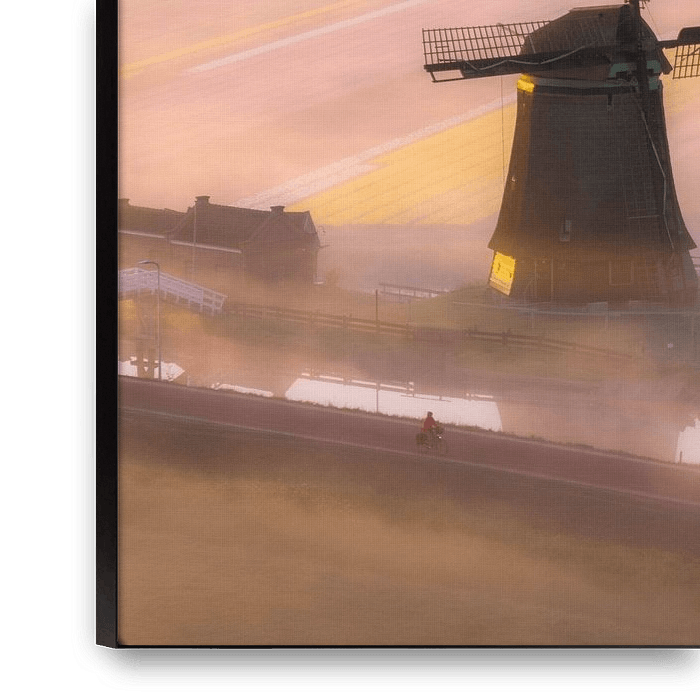 In the early morning, a soft veil of mist hangs over the vast polder landscape as the first rays of sunlight slowly awaken the land. A classic windmill takes centre stage in this hushed scene and is surrounded by colourful tulip fields visible as long, soft stripes through the mist. The shades of yellow, pink and purple blend with the…