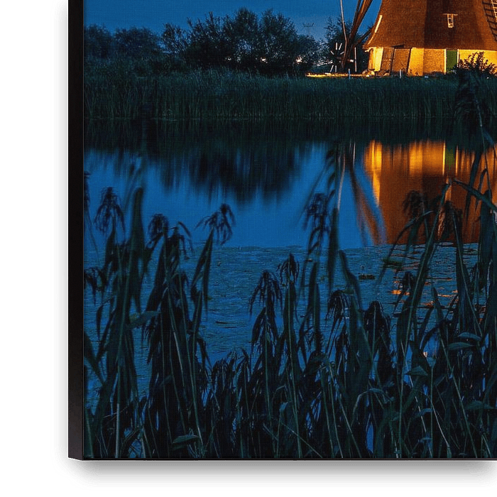 Buy this landscape artwork Mills Kinderdijk - Illuminated Mills by Fotografie Ploeg on canvas, ArtFrame, poster and wallpaper, printed on demand in high quality.