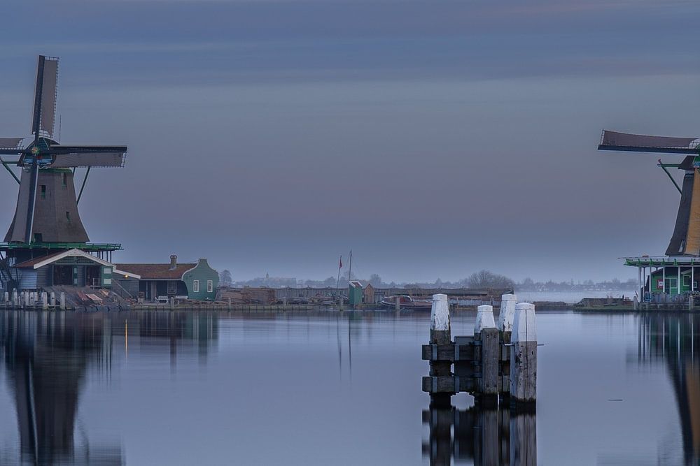 Just before sunrise two mirrored windmills at Zaanse Schans. Popular tourist attraction
