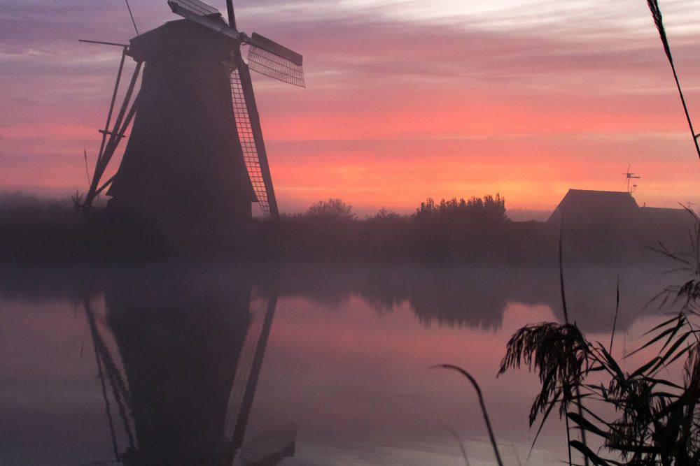 windmills on the water at sunset at Kinderdijk, the Netherlands