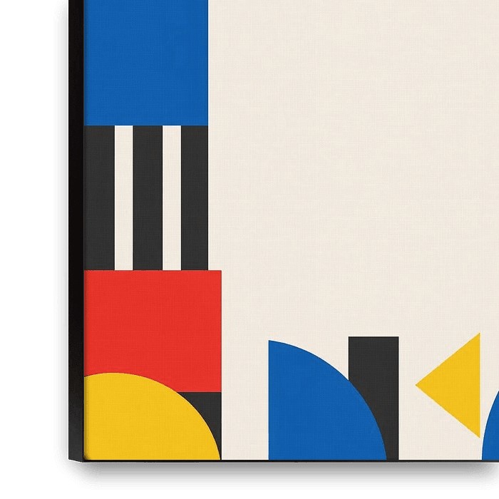 A minimalist abstract artwork inspired by Bauhaus principles, featuring bold geometric shapes, clean lines, and a balanced primary color palette. The open composition creates visual harmony and modern elegance, perfect for contemporary, mid-century, and design-focused interiors.