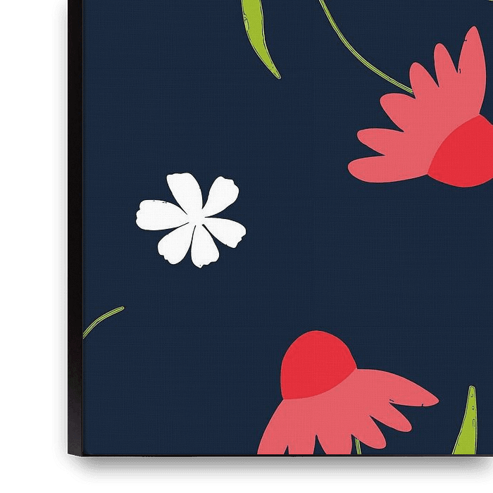 This artwork features a seamless pattern of simple floral elements arranged on a deep navy blue background. The design includes red abstract flowers, small white blossoms, and flowing green leaves, creating a balanced and playful composition. Subtle variations in shape and spacing add a natural rhythm, making the pattern feel lively yet…