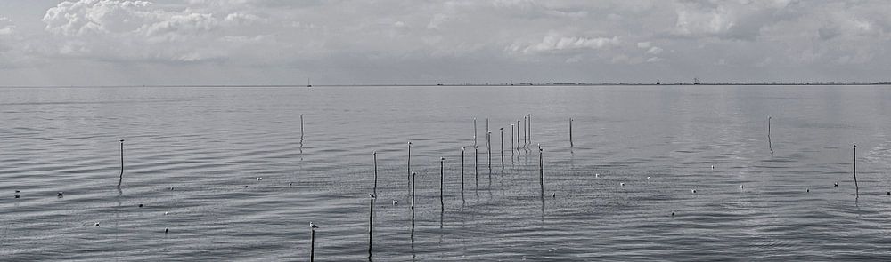 A panorama of a hazy horizon with poles in the foreground to which fishing nets are attached in terms of color this is quite neutral and nice romantic look.